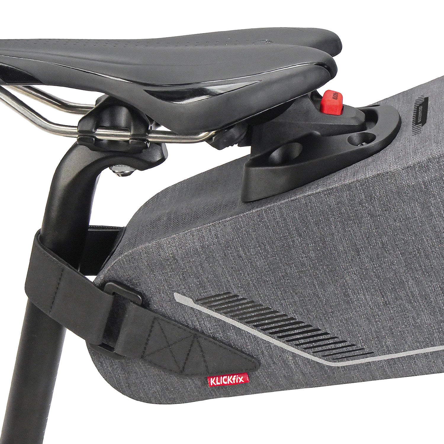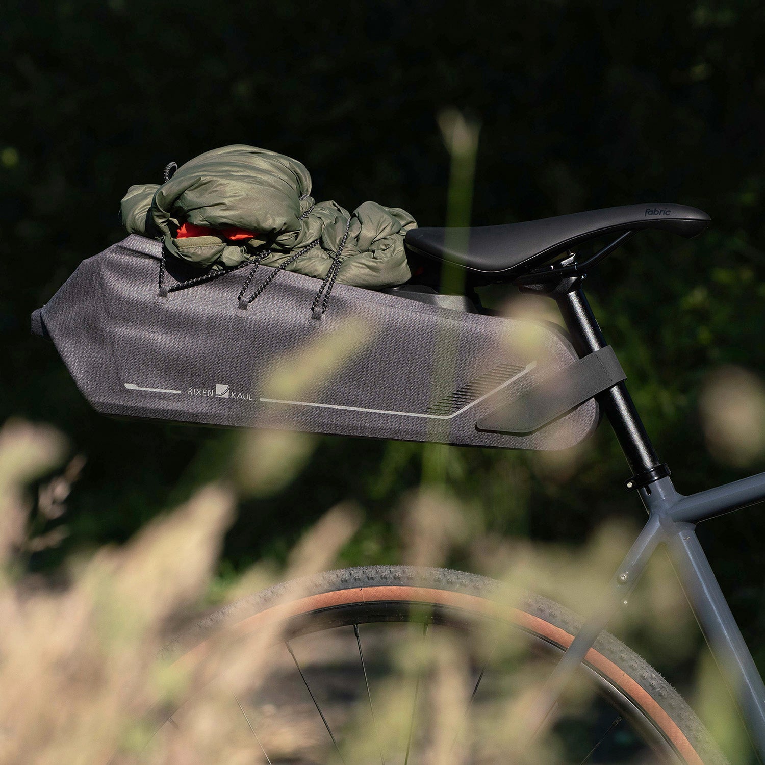 Grande sacoche de selle étanche pour le bikepacking, qui se monte et se démonte en un clin d‘œil, sans fixation fastidieuse. Il suffit de cliquer sur l‘adaptateur contour selle (inclus) et de fixer la boucle en velcro autour de la tige de selle, et le sac se place en toute sécurité sans se balancer.
